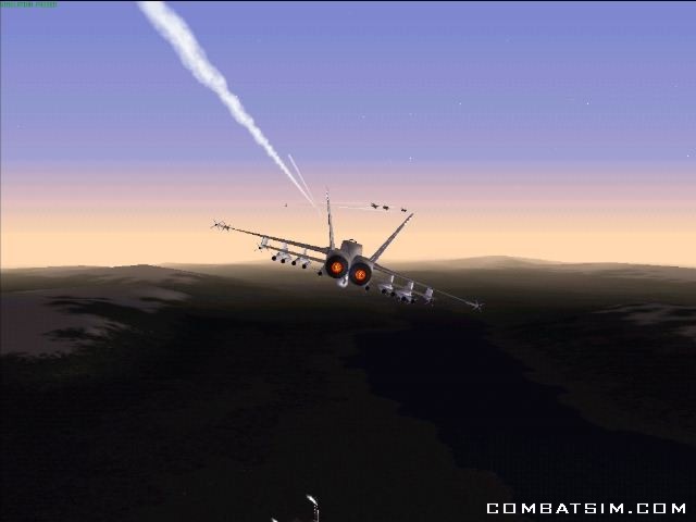 Fig. 4. Aim-9 heads towards the TargetThe Hornet's other missiles are the AIM-7M and AIM-120C AMRAAM. The AIM-7M is the latest variant of the venerable Sparrow missile, another weapon dating back to the Vietnam war. The main problem with the AIM-7(any model)is that it operates on what is known as SARH(Semi-Active Radar Homing), which means that the launching aircraft must keep its radar pointed at the target - a very VERY dangerous proposition in a dogfight, especially with MIG-29's carrying the dangerous IRSTS(InfraRed Search and Track System). A MIG armed with IRSTS can drop in behind a Hornet waiting for an AIM-7 to impact, and the Hornet might never know what hit him.