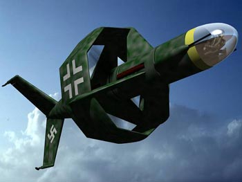 The Heinkel Lerche II (Lark) was a variation on the Heinkel turbo-prop VTOL Wespe in that the pilot lay prone in level flight and stood on landing, possibly to gauge touch down better and to take greater G-forces, from a completely Plexiglas nose of the 30.9-foot, 5,600-pound craft. Final blueprints came out in early March 1945. They called for the use of two 2,000 HP DB605Ds mounted in tandem driving contra-rotating props to provide lift and forward propulsion. The prop shroud/wing measured 13-feet. Range again is a question mark but speed was calculated to "be in excess of 497 MPH." Two 30MMs protruded alongside the nose bubble.