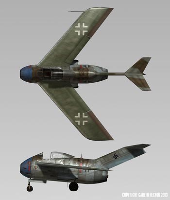 Me-262HG-IIThe original concept was that of a 2-seater with a radar operator in back. The fuselage was almost the same as the original, the tail was a "vee" shape and the wings were radically new. The HeS engines mounted as did the standard 262's but on the later HG- 3 they didn't hang under the wing like an afterthought. On the HG-3 they would blend in above the wing and were married to the fuselage. The wing, which was swept at 18-degrees on the operational 262, now had an extreme 43-degree sweep. The 262 went from sleek to slick and was more graceful to the eye.