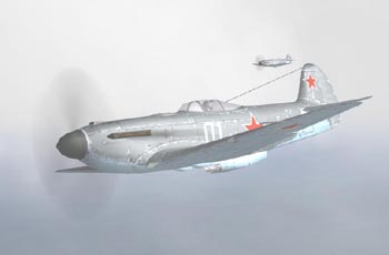 A pair of Vya 23MMs and one 37MM Ns-OKB-16 cannon armed the fighter. By 1947 two RD-21Fs with 2,205 lbs. thrust each gave a speed of 590 MPH at 16,405 feet attaining that height in 2.7 minutes in the prototype FF(I-307). This corresponds to the sim's F-2.