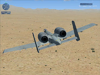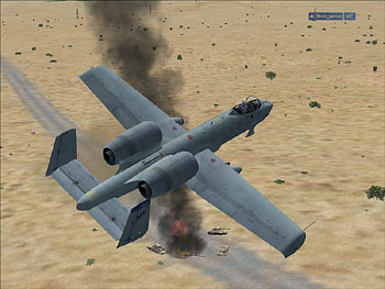 It doesn't want to climb for beans until over 250. That ain't right. Up that notch of flaps, and wallow on up. Finally feeling in control at about 300, I roll left toward the target. A music-accompanied voice tells me that there are tanks to whack at target one. The added trees make it a little difficult to spot, but I nose down and let rip at the marker. Fizz, pop. Fizz, pop. Nothing. As I overfly, I see a platoon of desert camo tanks a quarter mile down the road. With "Bitchin' Bob" piping up quite frequently with such items as "Sink rate," "Too low, terrain," and "Don't sink," it doesn't get dull as I sling it around for another pass.