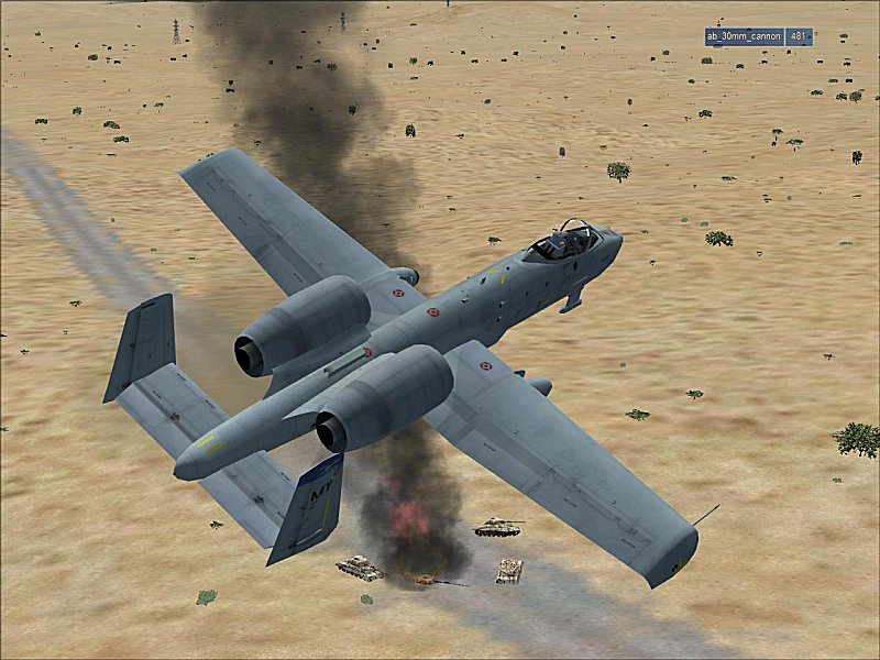 Click fly, and I find myself sitting on the ramp, in external view. Some guy chatting about the GAU-8, and there is a box in the upper right saying ab_30mm-cannon, 500. Interesting. I'm to ground strafe a building? That can't be. Weight on wheels switch should prevent that. The Shift-D, normally mapped to drop flour bombs, is the trigger. I happen to have it mapped to my X-52 trigger. Fizz-pop-fizz goes the anemic sounding GAU-8a. Adjust left a bit, more fizz-popping, and the building goes boom. Flames and smoke as well. Neat.