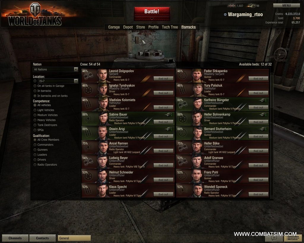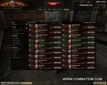 The barracks is, of course, where you get to see all your crewmen that will man your steel beast. Here you can recruit new crewmen, change their appearance, and train new skills. After each battle, depending on the outcome, your crew will gain valuable experience and will slowly level up. There is an option that will allow you to, for a certain amount of points, train a crew up to fifty percent. Each crew starts at about twenty-five percent. You can "send" them to the tank academy for training. This will help them in their individual tasks.