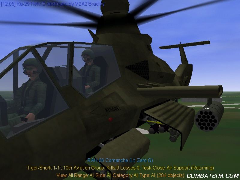 For my tastes the avionics are well done, they are not as complex as the ones found in Longbow 2 but they do the job very well. You will find that there are not a lot of changes from Apache Havoc as far as the radar modes and operations, if you have much time with A-H you will transition to EECH very easily. The Hokum has a nice new feature with the periscope; it will help with the long-range target identification during daylight missions. You can choose to make aiming your weapons easier with a few of the setting in the options menus, there is options to have the avionics realistic or novice and for the target ID to be novice, realistic or off all together. The novice avionics uses your HMS (Helmet Mounted Sight, Hokum) or your HIDSS (Helmet Integrated Display and Sight System, Comanche). This will allow you to lock any target that you have line of sight on; these systems will also not be damaged when in novice mode. The target ID options will change how hard it is for new people to get into killing things, when off the copilot will not ID targets at all, leaving this task for you. This feature would have been nice to use if the sim supported pilot/copilot multiplay.