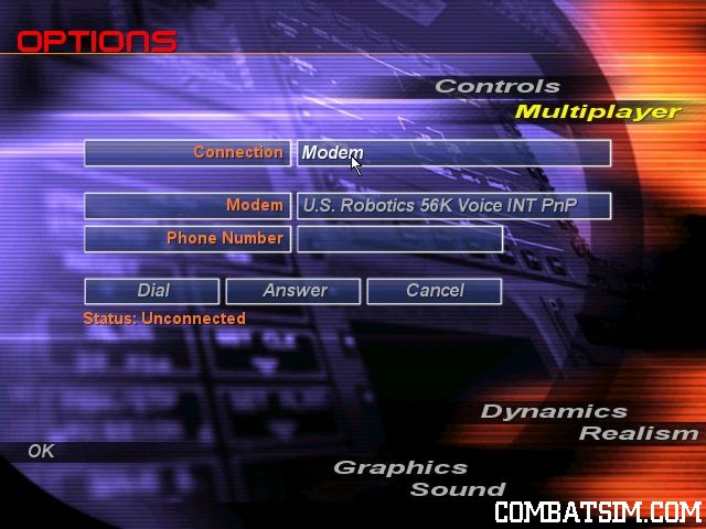 Fig. 11. Multiplayer Modem OptionsZero G says: The client may join as soon as the host selects the campaign and sees the map screen. We all get in the game and look for a suitable mission with the right number (and kind) of helicopters. We then decide who will fly what helo (1-1, 1-2, 1-3, etc.) This is important. The player in 1-1 (flight lead) has control of waypoints. If he dies then that control is transferred to the next pilot in numerical sequence (first 1-2 then 1-3, therefore if you choose to fly a co-op four ship mission and choose to fly in 1-1 and 1-3 your flight will loose control of changing waypoints if 1-1 goes down). We fly the mission until we run out of ammo or targets in the area, then back to a FARP to refuel and reload weapons, and perhaps add some waypoints, before we go again. This is generally repeated until all targets in a given area are killed or we are shot down. Then a new flight can be selected and the fun starts all over again. There are plenty of times where human players will take their own flight instead of flying wing so they can control an AI wingman. This says some good things about the changes made to the wingman AI since it is nice to have the extra firepower along when things get busy.