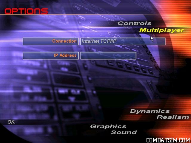 Fig. 10. Multiplayer Options TCP-IPGetting online via the Internet or a LAN is pretty easy. The host for Internet games just clears the IP address. Clients enter the host's IP. The host chooses a Campaign or Skirmish, then a side (Blue or Red), and generates the Campaign or Skirmish. As soon as the host is at the map screen, the host's callsign appears with the name of the selected Campaign or Skirmish next to it and all clients can join. In online testing we have had the best success if all the clients do not attempt to join at the same time. Since Internet multiplayer sessions will probably involve only three or four pilots at most, this is not onerous.
