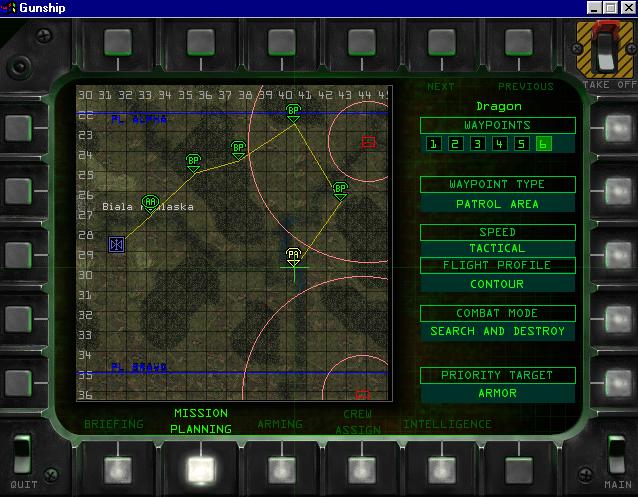 The waypoint settings, found on Communications menu and the Mission Planning screen, offer a tremendous level of control over the Pilot's actions and flying style. Again, and unfortunately, the manual really only touches on each of these settings briefly. A brief guide to mission planning would have been welcome here. All the settings for each waypoint can be changed on the fly from the Communications menu (or by toggling back to the map screen). Using the Communications menu can be a bit challenging but provided you the opportunity to stay in the Gunner's cockpit and maintain situational awareness. The first time you get shot down while trying to adjust the waypoint setting via the map screen will probably by the last time you try it. I suggest calling the navigation display up on one of your MFDs for reference, tell the Pilot to Break for Cover, and use the Altitude Down key to really get the helicopter down behind some trees, and then adjust waypoints.
