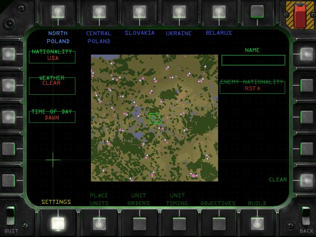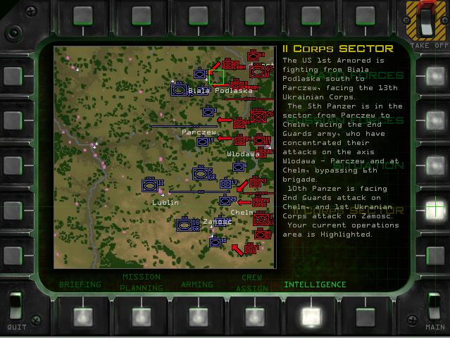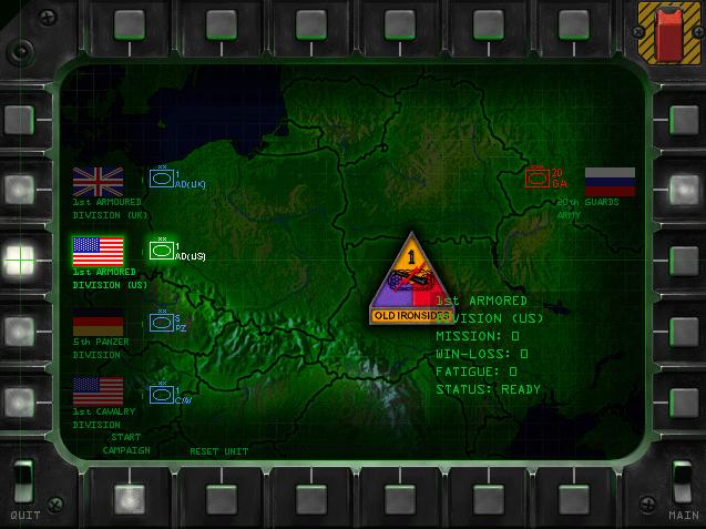 Fig. 6. Main Campaign ScreenThe campaigns are all set in Europe but not the Europe I know. The Europe I live in is hilly, filled with huge valleys, mountains, and delicate landscapes. Gunship's Europe is dead flat with not a mountain or even a hill in sight. From a realistic military campaign point of view, which side you start a war on is very important. On the Gunship! box it reads "Unparalleled attention to detail: weapon systems, sounds, threats and terrain." I do not know if they were paying attention to detail because the landscape lacks attention to detail in European-like terrain.