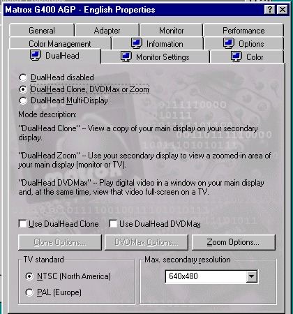 ![]() Matrox's DualHead technology differs from traditional multi-monitor support because the second output device can be anything from an additional monitor, a TV, or a flat panel display. Additionally, the second display output can function at an independent refresh rate than the primary display. The result? You no longer have to live with the flicker that results from using a TV as a display device. Large screen TVs suddenly become attractive options! In order to use the second display output, which is a VGA out from the G400 MAX, you must hook up a second monitor or use the adapter provided. The adapter has an S-video out or a composite out. There is a limitation here, however, since the second display does not connect to the 360MHz RAMDAC. Instead, the onboard Cathode Ray Tube Controller manages the second display output via the MGA-TVO chip for analog signals. The second display device is limited to 1024x768 for TV and 1280x1024 for a monitor. Who will use this technology? With DualHead you can have the secondary display running a DVD while edit an article (hint,hint!) Some game developers have taken notice, and Microsoft's Combat Flight Simulator will let the secondary display be used almost any way you like. (In CFS running an additional view window caused a frame rate drop from 38.5 fps to 33 and with an outside view down to 30; PII 500 at 1024x768.) For example, you can have your forward cockpit in one screen, and an enemy view in another. Or use one for an external padlock while you fly forward view in the other. Activision's Star Trek Armada will use the primary display for the bridge while the secondary display is a view of the battlefield. Let's hope that more companies take advantage of this technology. Harpoon4 would be awesome with dual displays! Go to Vibrant Color Quality
