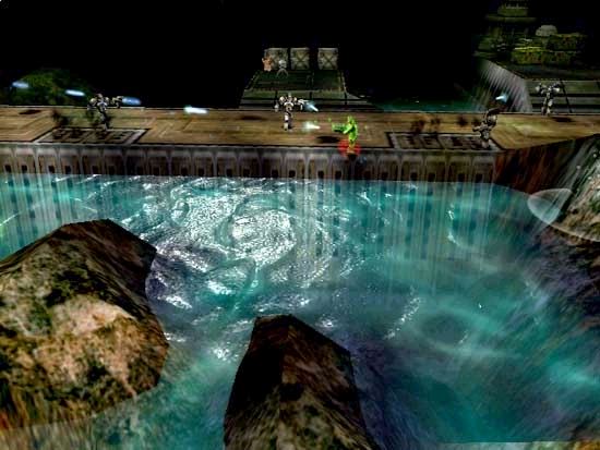 Vibrant Color Quality2 is the term that Matrox has trademarked for their color rendering technique. In order to achieve maximum precision in rendering color, all images are rendered using a true color palette and full 32-bit precision in the internal pipelines of the video card. If the resulting image to be displayed is 32-bit, it will be very accurate across color gradients. But if the resulting image must be 16-bit, then all the internal calculations occur in 32-bits and are finally dithered to 16-bit from a true color palette. This eliminates much of the streaking, banding and other artifacts that are commonly produced by this process. The proof is in the pudding, but there are two facts worth noting here. These new video boards take a much smaller hit when running full 32 bit color than the last generation. But if the artwork and textures for the game have been rendered in 16 bit color then you won't gain much by running in 32 bit mode. I checked with Wayward studios on their coming B17 II simulation, and they confirm that the artwork is being done in full 32 bit pallettes! The subjective test of VCQ2 comes in the form of comparing a Falcon4 mission on Voodoo3 vs. Matrox G400 MAX. Could I see the difference? Yes, to my surprise, colors appeared richer at the same resolution and color depth in the same mission on the same monitor running the G400 MAX. The G400 chipset has hardware support for a form of texture control called Environment Mapped Bump Mapping. TNT2 and Voodoo3 support embossed bump mapping, which is not as accurate or as impressive as environment mapped bump mapping. Check out these two screen shots from Expendable to see the difference. The first shot is with embossing OFF, the second uses Matrox own hardware based method.