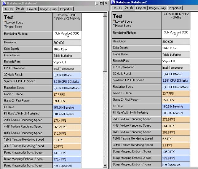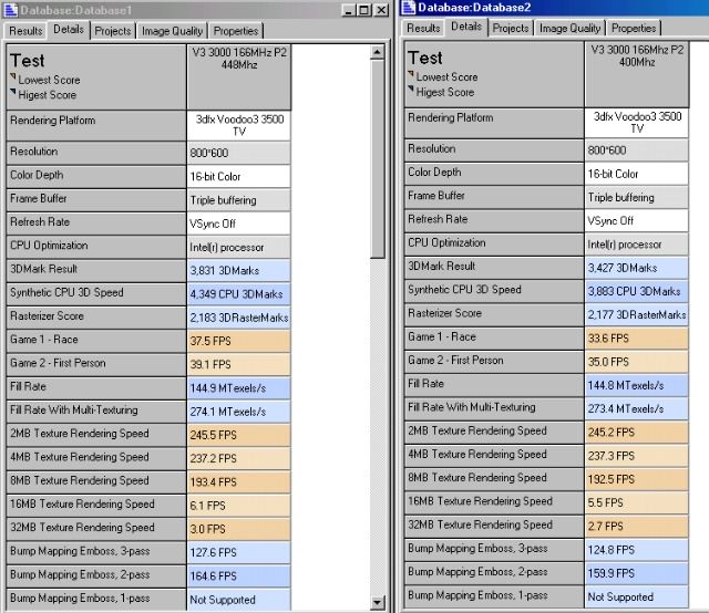 Test3: Dual Processor P2 400 Papa Doc benchmark: 21.508 FPS Falcon 4.0 is not optimized for dual threads yet. We know that because fellow COMBATSIM.COM™ writer and Falcon 4.0 Senior Instructor Pilot Mark Doran and I have both spent some time with Falcon 4.0 running Dual Processors. Each processor is only being utilized up to 50%. Each processor SHOULD be running at 90-100%, which would yield much higher framerates than we are seeing now. Of course, as you can see from the benchmark, 21.508 FPS is the highest recorded yet. So even though the processors are not being properly utilized yet, the efficiency of both along with the fastest 3D card made add up to a pretty sweet setup! This Papa Doc benchmark is a real FPS killer! 3DMark 99 MAX is a great benchmark program, which has really become a standard in the industry. I ran four tests, one simulating a V3 3000 (clock speed was 166MHz while clocking my processor between 400 and 448 MHz.) For the other tests I ran the V3 3500-TV at its shipped clock rate of 183MHz while again running my CPU's from 400 to 448Mhz. Above and right are the scores from 3DMark 99 MAX. |