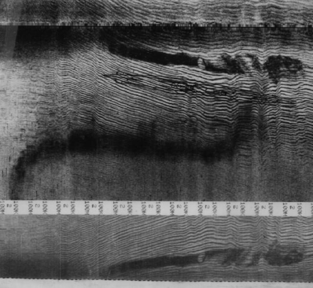A blowup of the forward end of the wreck, showing the sand convergence over the bow, with the starboard hydroplane outline clearly visable at the upper left of the screen. One of the additional side-scan sonar images taken from a different angle. Note the sub-silhouette picked up in the survey boat's wake at the bottom of the screen. This is due to double-refraction of sound signals, which in essence causes a 'silhouette' of the object being insonified to appear. The hard contact at the top is the actual wreck, with a slight curviture of the con. visible amidships. The bow is to the left (we have laid a scaled black-line arrangement plan alongside the hard contact for comparison, scaled to the same as the sonar image - 115. meter long wreck). Wreck was insonified with 100kcys. at 100 meter range. Watch for an update as more information becomes available. You can also visit Trident Research own web site at Mall of Maine.