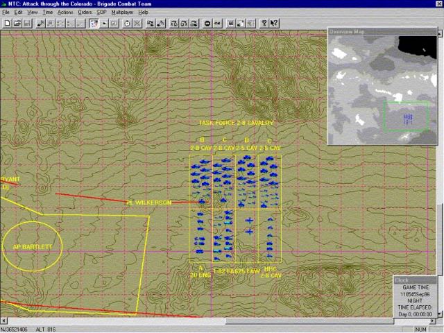 After selecting one of several scenarios to play, you have to scroll to the deployment area. Units are grouped together and you merely click and drag them into the game area, marked by standard maneuver graphics. Right clicking before dropping the unit gives you instant access to the line of sight tool (more of which later) to assist you in placing your units. Obstacles (mine fields, wire, and ditching) and fighting positions are also deployed in this manner. After you are satisfied with your set up, you can save the game or save the set-up. The difference between the two is saving the game will deliver the same OPFOR attack every time (to the best of my playing so far) while the set-up allows it to be varied. A saved set up can also be used to speed the set up for Internet play. Pushing "go" disables the set up mode and lets the games begin.