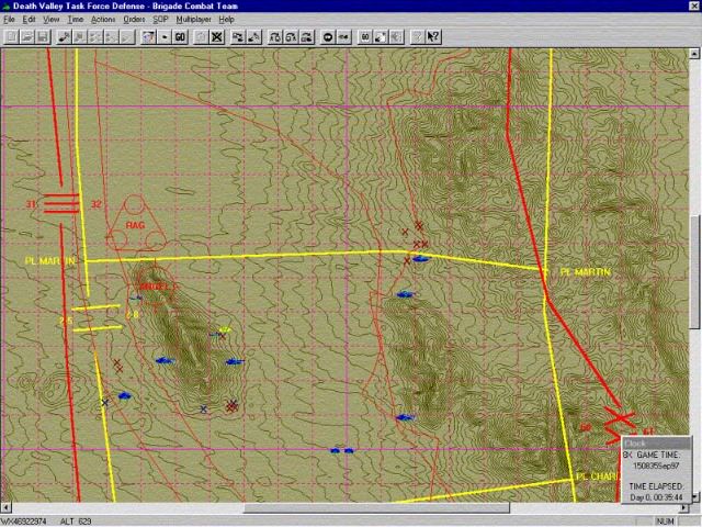 Fig. 3. The End of the counter recon battle. Here a forward deployed company has destroyed the OPFOR reconnaissance patrols and the Forward Security Element (black 'X's). Note the yellow "unidentified" icon. Even though we can't identify and kill him with direct fire, you can use artillery fire and he can call for fire on any units he can see.