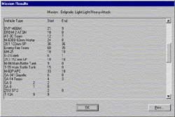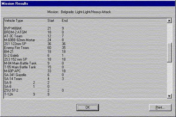 ![]() Fig. 5. The game status report that appears at the end of the game showing the OPFOR losses. Another problem is there is not a single database for the game. Instead, each scenario has its own small database. While this does enable different forces using the same equipment to have different proficiency levels reflected in such statistics as rate of fire, probability of hit, and probability of kill, it is frustrating because the performance of a piece of equipment can vary markedly from game to game. For instance, the M1A2 has rates of fire from 15 to 45 seconds. This can make a big difference in winning or losing the game when you have a battalion trying to take out an OPFOR Regiment across the sands of the NTC. Fortunately, PROSIM is correcting the problems a little at a time and the upcoming release of a scenario editor should allow the user to adjust these values to his satisfaction. A vehicle specifications menu item lets you examine their attributes in detail. The game's basic black maps make it difficult to see some icons, particularly destroyed vehicles (marked by an 'X') or indirect fire (marked by 'o') and sometimes it is hard to find and issue orders to vehicles stuck in mines or forest, but the color maps mitigate these problems. Finally, the game does not respect the start bar, does not have a minimize buttons, and some windows - the clock and the Overview Map - appear on top of any other applications, even when you switch to say, Microsoft Word to write a review. As a game that is downloaded from the Internet, embedded documentation is a little weak. Making up for that is an extensive Internet help section at the company web site, as well as a downloadable set of documentation from http://www.prosimco.com/. Finally, Captain Proctor is quite active on the Internet, and can be counted onto provide timely and accurate answers to queries, sometimes even when in the field or on leave. PROSIM is defiantly devoted to customer service.
