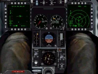 Joel Bierling sent me another cockpit mod. These also are based on the previous work of the other freelance cockpit artists. Joel's claim to fame is the addition of the ADI, VV, and AOA indicators to the down left and right views. All views were compared to pictures of real F-16 cockpits for more accuracy (especially for the night time look). Following are two images from his work: