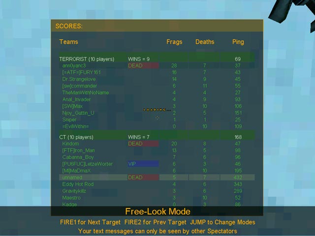 Fig. 9. incognito...In Counter-Strike, it's the guns and their appropriate usage that make this game so exciting. First of all, nearly every single gun has its supporters. I've heard people tell me that the Desert Eagle handgun is the only weapon to use. I've found that the shotgun is an amazing weapon which can absolutely blow away players in CQB situations. Meanwhile, assault rifles deliver the punch that machine guns cannot.