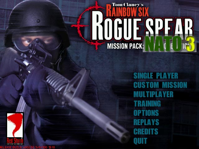 Fig. 1. The revised Nato3 title screenTo date, the biggest complaint for mod makers has been their inability to make new (from scratch) levels to supplement the original Redstorm releases. Mod makers can modify game features, such as weapons and skins, to their heart's content, but for most of these makers, this just doesn't cut it. But there are some who have made do without the level-making abilities. There have been a few substantial mods that really maximized the use of the limited modding capabilities of Rainbow Six. By far the most well know series has been the NATO series produced by the Alliance of Rainbow Six Mod Makers or ARMM. Their first edition of NATO, created in the very first few months of Rainbow Six, was if nothing else an example of what could be done. They successfully capitalized on the desire of gamers to have more guns in the Rainbow Six engine and (more importantly in my opinion) made the guns based on their real-world counterparts. No BFG1000s in this gun pack - only real guns, created by guys who knew what they were talking about (I'll discuss their particular talents in a bit).