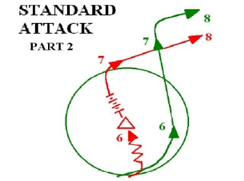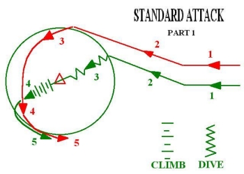The above diagram depicts a standard or welded attack. It can be to the left or right. Both fighters enter the target area in combat spread at time 1. At about 6 NM from the target, the flight leans to the right about 15 degrees or so. This initial offset direction is how we name the attack, in this case, "standard right". This has the effect of pushing dash two out in front slightly, as shown at time 2. At time 3, lead has arrived at the attack cone (indicated by the green circle), and has rolled in on the target. Notice that dash two remains up at altitude in a position to look through lead into the target area. Two's responsibility during this time is to watch lead's back while he concentrates on his attack run. Off target at time 4, lead should acquire dash two coming across his nose as he is climbing back up to altitude. Lead turns to follow as dash two arcs out to the attack cone in order to arrive in trail at time 5.