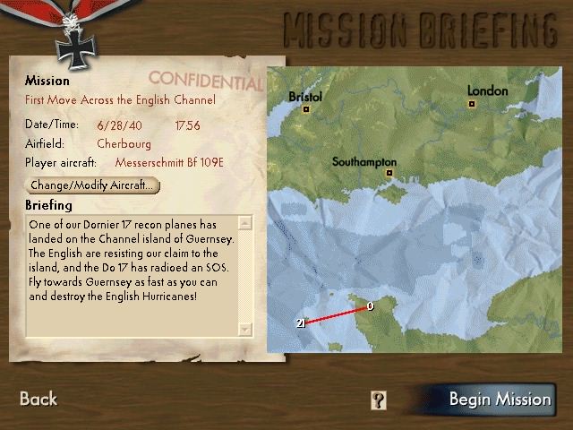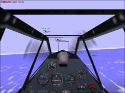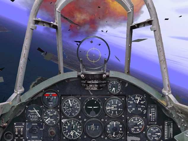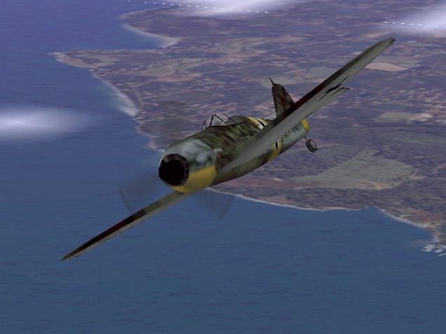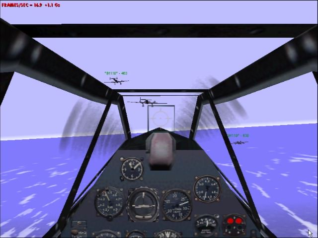 Padlock views are good, though unless you have a monster system it takes a little while to switch back and forth from padlock to fixed view. Best to do it once before the fight if possible, this seems to help set it up and next time it works faster. In fact Microsoft has pioneered a fixed view padlock system that is one of the most effective yet seen in a prop sim. Once you select your target, you will have additional information superimposed around the object. You can toggle this info on and off according to your preference, but so long as your target is selected it is marked by a color in the tactical window and by a 3d conical arrow that appears on screen, always pointing to the direction you need to pull to bring your target within your deadly crosshairs! If you prefer, you can switch to a virtual cockpit. This view gives better visibility than the full cockpit and less than full screen, but still includes functioning instruments. And as in Flight Sim '98, you can configure multiple windows with the views you prefer to give you a much improved situational awareness. Oddly, one of the few oversights in the view system is the lack of a friendly padlock. Perhaps this is because little emphasis was put on interaction with wingmen. One hopes that a friendly padlock will arrive in an update, since anyone who's tried to fly with a wingman knows how impossible it can be in a dogfight to keep track of your wingy. Environment: To quote a friend, a military pilot, "When I come up on a bogie in CFS, I get the sense of flying form on someone (which I have done a lot for real), but I did not get this same feeling in … (insert other sim here)." In my book, environment encompasses not just scenery but many things, and is essential for suspension of disbelief. It includes scenery and sound, i.e. things like radio chatter, doppler sound effects, and wind, sun glare and G effects as well as how your plane interacts with the "physical" World. In these departments, CFS again comes out at least as good if not better than most of its rivals. The scenery in CFS is second to none, if you have the hardware to run it. I would suggest at least a PII 233 and Voodoo II or comparable. However, I have successfully run it on my P166 mmx with two Meg, Cirrus Logic video adapter. (Setup tried to put the resolution at 320 x 240 x 16 but this looks like hell (runs at about 10 fps), and returns you to the bad old days of jagged and pixilated lines). On my 166 CFS will run at 640 x 400 on low display complexity, about 8 fps, depending largely on how many planes you have going at the time. Clearly not the ideal setup. However, add a Voodoo card to the 166mmx setup and you will have a workable system with quite acceptable performance. In 1 v 1 I get 20fps at 640X480. Microsoft gives these specs as minimum: