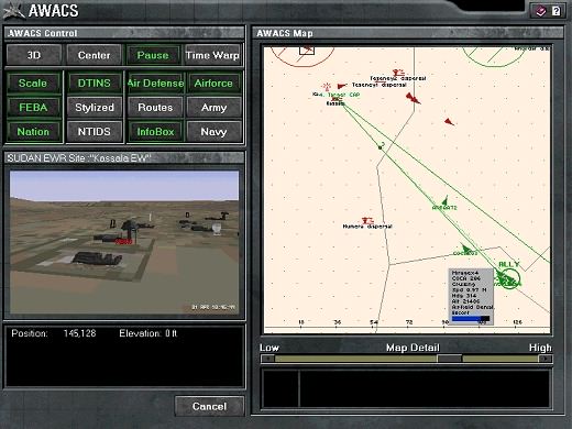 Our version of EF2000 v. III would ensure that threat radius circles are distinguishable by type when multiple types are selected at once (e.g. make EWR radius and SAM envelopes show with *obviously* different "fill" patterns). Now as for control ability, a great deal can be done. The current command set given to the AWACS chair is extremely slim. The click/drag/drop MAP interface could be enhanced to include the following: