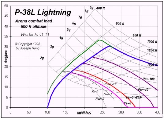 The lines marked Ps (specific excess power) indicate the change in energy state, expressing it as a change in altitude in feet per second. The most significant of these curves is Ps=0 (and Ps=0 WEP), which shows the sustained turn performance possible at speeds and G-loads within the envelope. To maintain energy while turning at higher speeds, keep the G-load within this curve.