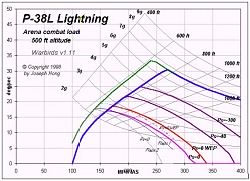 For this short example, we take the data from the P-38L Lightning as modeled in a popular air combat simulator. The simulated aircraft is loaded with 25% fuel and 100% ammo. The heavy blue line shows the regular Lift Limit, or the lift available for turning. The peak of this line is the corner velocity at 270 mph and 6.67 G, with a resulting turn rate of 30 deg/sec.