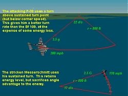 At points above the Ps=0 curve, turns cost energy. This energy loss is manifested by either a loss of airspeed or a drop in altitude. The curves marked Ps=-40 and Ps=-100 plot the relative loss incurred for high-G maneuvers. They show very clearly how an instantaneous turn at corner velocity cannot be sustained. However, it is possible to maintain the peak turn rate at Ps=-40, by taking a shallow dive to offset the energy loss. At 200 mph, a nose-down attitude of about 8 degrees is required, resulting in a descent of about 2400 feet per minute.