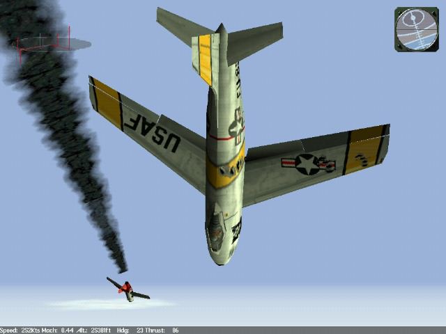 ![]() MiG Alley Huh? Welcome to the new world of structural failure modelling in flight sims. PCs and sim codes have now become sufficiently fast and sophisticated to simulate such realities. Sims like MiG Alley certainly provide a rude shock to those PC fighter jocks who have a habit of heavy-handed stick hauling. No fancy fly-by-wire G-limiters to molly coddle you. Time to rediscover the light touch or life will get short for heavy-handed yank and bank jocks! A Question of Factors First, a little terminology to square away. Most accelerometers (G-meters) in non-zillion dollar aircraft, measure load factor (G) along the aircraft centreline. The maximum value shown on the meter is typically called the limit load factor or maximum G. So why don't you hear the dreaded explosive failure when you pull the maximum G? Without going into a lengthy discussion about limit and ultimate/design load factors, the short answer is that the maximum G is not the calculated failure load factor of the airframe. The ultimate or design load factor is the point at which failure is expected. Its value is 1.5 times the limit load factor or maximum G. The 1.5 multiple is known as the factor of safety; and is a deliberate reserve buffer. So for example, if the limit load factor is 6G, then the ultimate load factor is 9G (6G x 1.5). In MiG Alley, the F-86 accelerometer shows 9G as the maximum value (ie limit load factor) which means that the theoretical ultimate load factor is 13.5G (9G x 1.5). In practice, as an airframe ages, its ability to withstand load factors up to the original design specification becomes increasingly doubtful. Go to Part II