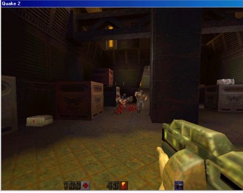 ![]() Fig 4. Lightmap aliasing problems in Quake 2. Note the jagged edges around the light sphere cast on the ground by the firing of the gun. |