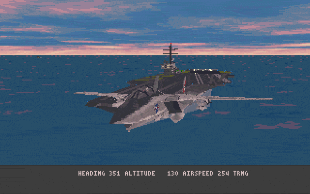 If all this is just too much for you to deal with, take heart. Microprose decided at the last minute to allow use of the landing cheat key even at the hardest difficulty level with training mode turned off. Hitting this key repeatedly will eventually take you to a point just before touch down. As long as you don't mess with the controls too much, this will quickly zip you through the landing process and put you safely on the carrier deck.