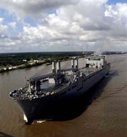 USNS PILILAAU (T-AKR 304), the fifth of seven BOB HOPE Class Strategic Sealift ships being built by Northrop Grumman Corporation's Ship Systems sector, departed Avondale Aug. 24, 2001, after being delivered to the U.S. Navy ahead of schedule one month earlier. PILILAAU earned an outstanding Acceptance Trial evaluation from the Navy and the Office of the Supervisor of Shipbuilding, Conversion and Repair, New Orleans, earlier this summer.