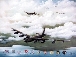 This painting by Roderick Lees was commissioned by Maj. Blaise Martinick, a radar navigator on Operation Secret Squirrel. It depicts the seven B-52Gs on their flight Jan. 16, 1991. At the bottom are nose-art paintings from six of the B-52s, and the Strategic Air Command shield, the 2nd Bomb Wing shield and a "Magnificent 7" emblem.