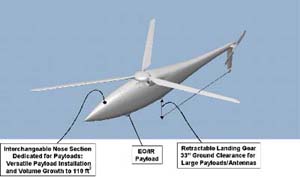 During the course of the planned 36 months of flight tests, the programme will demonstrate variable RPM flight; completely autonomous flight operations including autonomous takeoff, waypoint navigation, and autonomous landing; and integration of various sensors such as electro-optical/infrared and radar packages. The programme's ultimate goals are to demonstrate these capabilities in conjunction with the overall programme objective of more than 40 hours endurance and a 2,500 nautical mile range with a 300-pound payload.