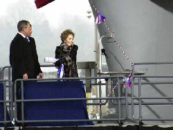 It only took one swing for former first lady Nancy Reagan to break the traditional bottle of champagne across the bow of the Navy's newest aircraft carrier, named for her husband. President George W. Bush assisted in the christening of the USS Ronald Reagan in Newport News, Va., March 4 in freezing temperatures and steady rain.