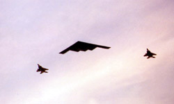 A B-2 Spirit bomber is flanked by two F-15C Eagles.