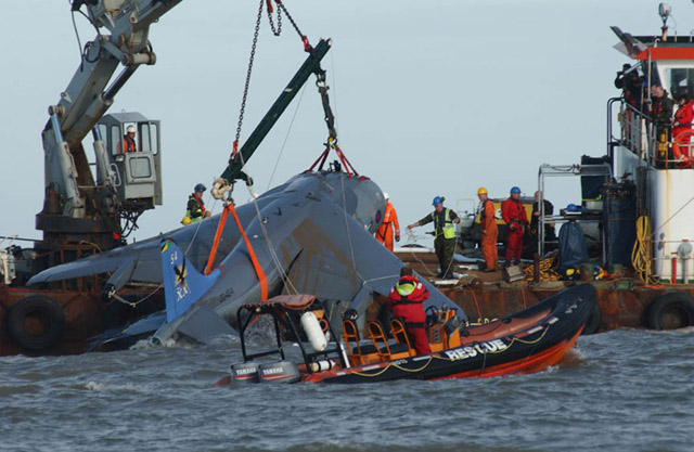 An RAF Harrier that crashed into the sea off Lowestoft was successfully salvaged on 8 August 2002.