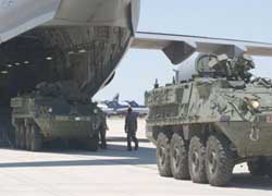 A Stryker mobility demonstration that was conducted at Andrews Air Force Base, Maryland, on Wednesday, Oct. 16. During that demonstration, four Stryker vehicles and infantry troops were flown to Andrews AFB aboard a C-130 cargo plane and a C-17, and within 8 minutes had deployed in a 'combat ready' mode. Witnesses at the event included Secretary of the Army Thomas E. White; Dr. Stephen A. Cambone, principal deputy under secretary of defense for Policy; Gen. Shinseki; and former Speaker of the U.S. House of Representatives, Newt Gingrich.
