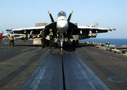 The F/A-18E Super Hornet participated in its first-ever combat action Nov. 6 when aircraft from USS Abraham Lincoln (CVN 72) fired on Iraqi targets. In response to hostile acts against coalition aircraft monitoring the southern no-fly zone, Operation Southern Watch aircraft, including the Super Hornets from the Abraham Lincoln, used precision-guided weapons to target two surface-to-air missile systems (SAM), and a command and control communications facility.