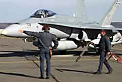| Official U.S. Navy file photo of a "trouble shooter" giving the final thumbs-up before an F/A-18C Hornet launches from USS Theodore Roosevelt (CVN 71). Lt. Andrew Hayes recently received the Distinguished Flying Cross to honor actions above and beyond the call of duty in aerial combat while embarked aboard TR in support of Operation Enduring Freedom. |