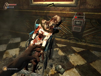 Then turning to leave my heart stops in my chest as I find myself staring into the eyes of a medical coated Splicer whose face is inches away from my own! In a blind panic I flail outward with my wrench and the man falls to the floor and lies still. Gasping for breath I stand over him for what seems like minutes, but is probably seconds, before regaining enough wit to once again move on. I truly believe that many more shocks like that one and I will die of a heart attack and this place will become my watery tomb!