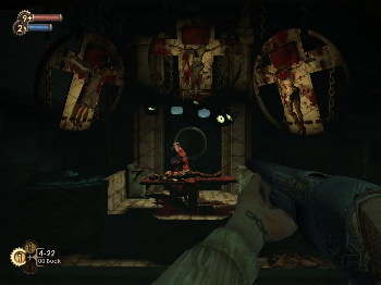 The hidden turret in the second viewing area was a nice touch I thought. To be honest I was just starting to worry that I was pretty much getting into the swing of predicting when Bioshock was about to throw something at me, for example I wasn't at all surprised when the woman jumped out from behind the coffin, but I must admit I wasn't expecting that turret and the noise of the thing gave me quite a start.