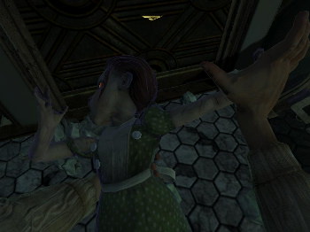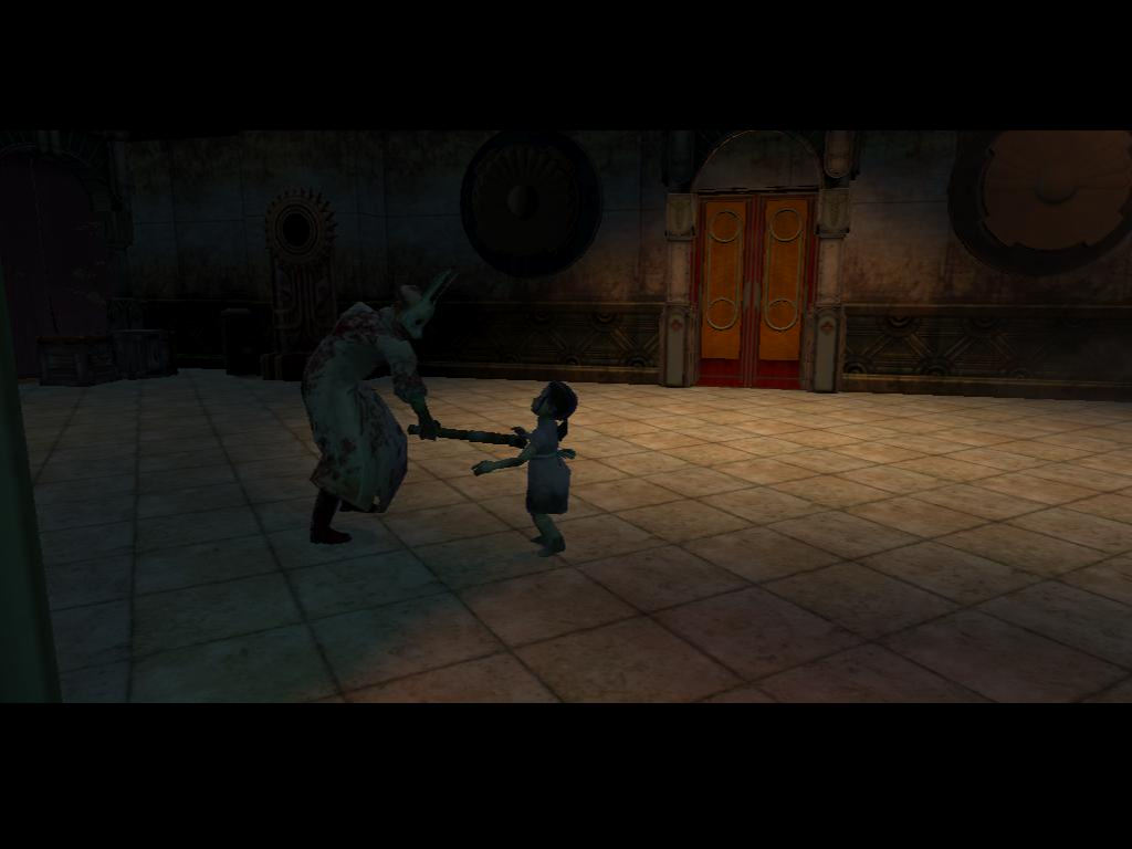 The new walkway seems only to extend a fairly short distance and on the right I can see the windows of a room branching off it. As I move forward a child screams and the window suddenly dissolves in an explosion of glass and wood as the huge figure of a Big Daddy flies backward through them and crashes into the reinforced glass of the walkway before slumping to the ground!