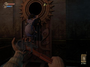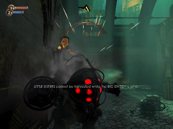 Approaching carefully it becomes evident that the Big Daddy does not see me as a threat. In fact he gives no indication what so ever that he is even aware of my presence. But then as I stray a little too close to the girl, the creature bellows a blood chilling cry and turns menacingly toward me with his giant rivet gun raised and I quickly back away!