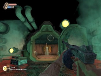 I'm barely finished before an explosion sounds in the chamber behind me, closely followed by a scream and the tell tale howl of a Big Daddy. Peering around the corner into the chamber where I stood only minutes before, the scene immediately tells the story.