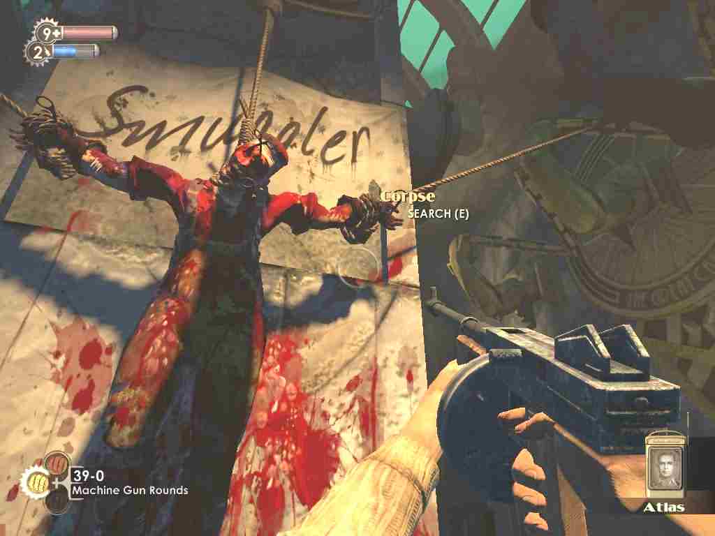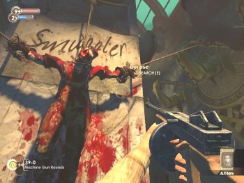 In front of the Bathysphere a single long flight of steps reaches upward and at the top a large pillar extends from floor to domed ceiling and on it is the grizzly sight of a crucified body! With a deep breath I move upward, closer to this latest example of Andrew Ryan's handiwork.