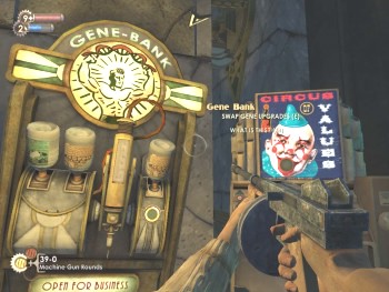 Against one wall stands a "Gene Bank" which I already know would allow me to change around my Plasmid powers if I wanted to. A little past it is a vending machine and I set about hacking it. At the back of the chamber a large ornate doorway opens upward with a sound like a chain portcullis and cautiously I move onward.