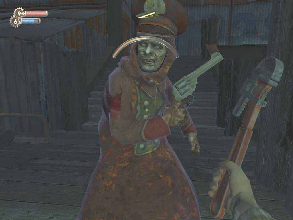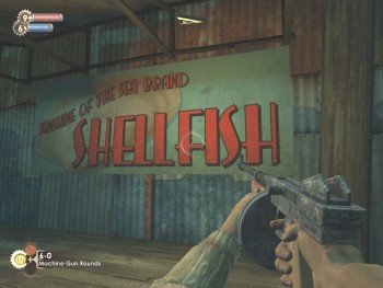 My eyes are dragged to movement ahead and for the first time I see a Big Daddy plodding slowly across the basin between jetties. As I watch, a shadowy figure appears on one of the balconies above and opens fire on the creature with a revolver! The Big Daddy returns fire with a grenade launcher, causing a ream of deafening explosions overhead. As the battle rages I make my way through the doorway on my right, passing a flapping fish which dances on the floorboards, gasping out its last seconds in a vain attempt to breathe.