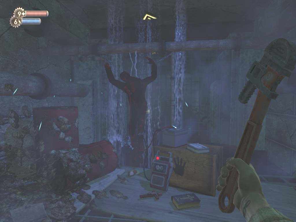 The eerie sound of singing floats up from downstairs as one of the Splicers recites the words to "Jesus Loves Me". The irony is not lost on me here in this place of the damned and summoning up my courage I stand in the open at the top of the stairs and wave my arms to attract attention.
