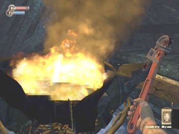 Sure enough a group of four Splicers round the corner almost as this thought crosses my mind! Lashing out again with Inferno I ignite an oxygen cylinder in their path and the first two are hurled backward and over the edge of the gantry. The next creature stumbles screaming into a puddle of fuel ignited by the blast and wanders in flames back toward his comrade, who also catches alight. Both of them fire their pistols wildly and I duck low on the gantry as they disappear out of sight down the stairs.